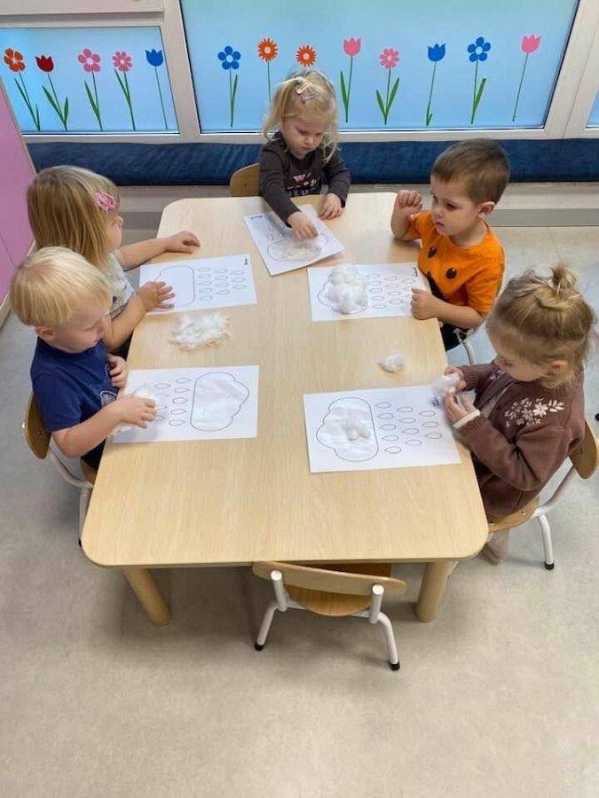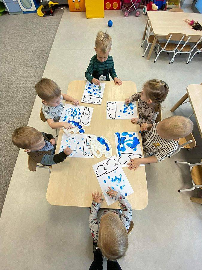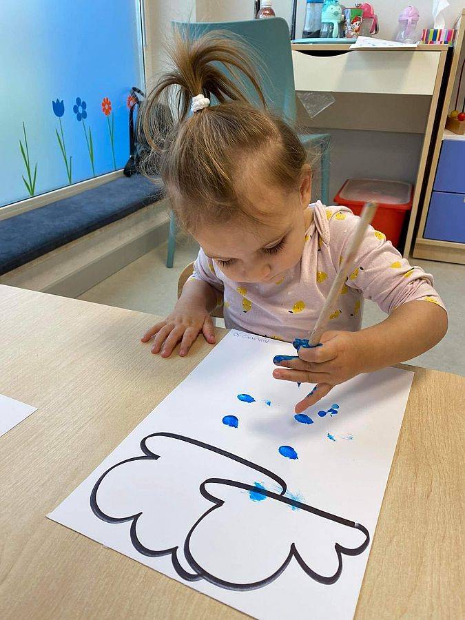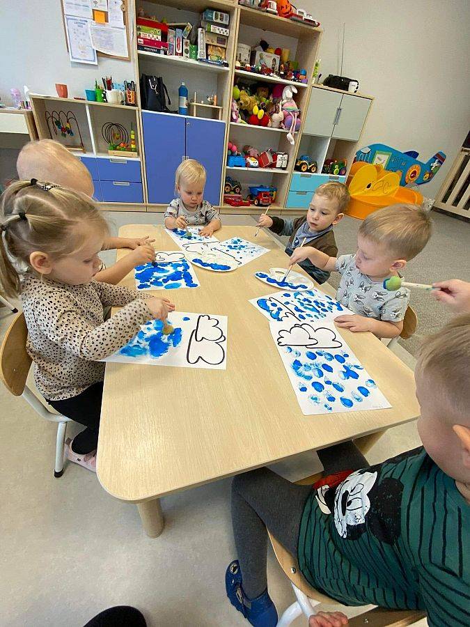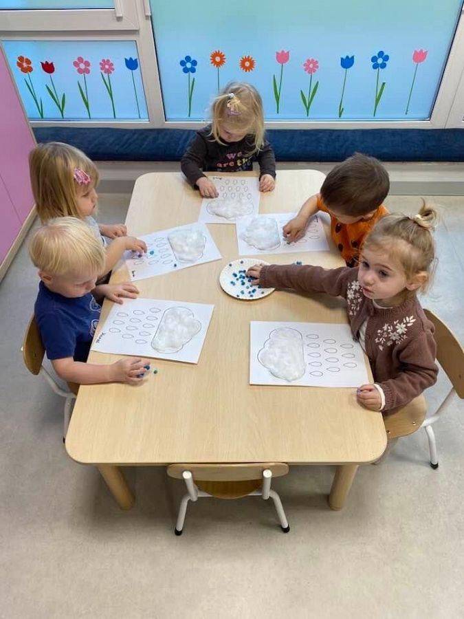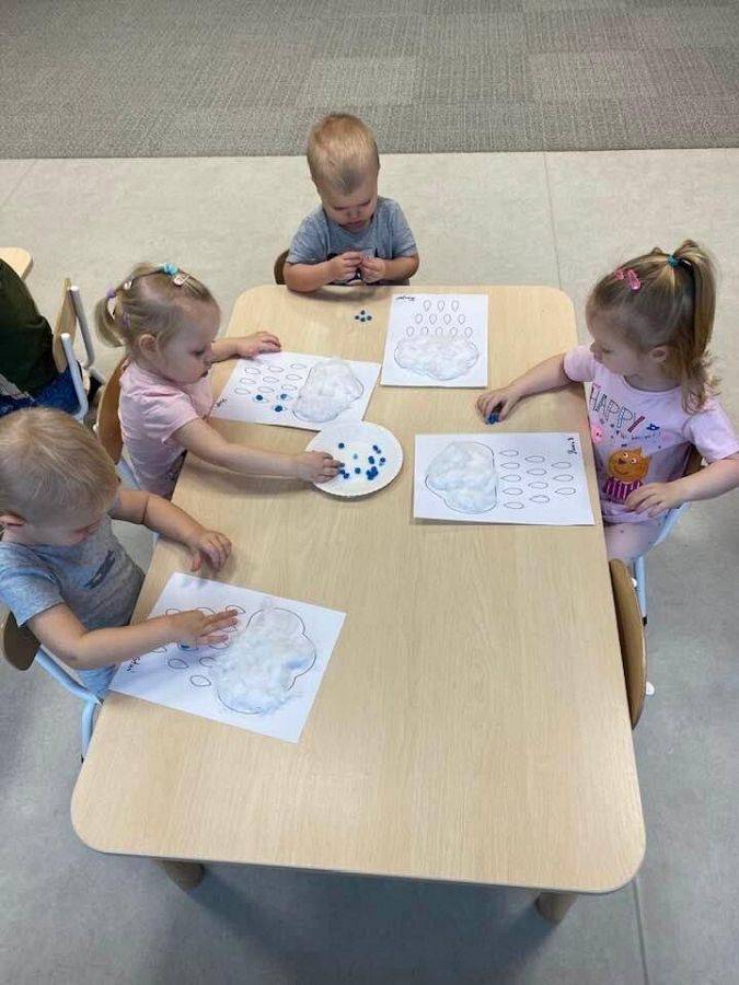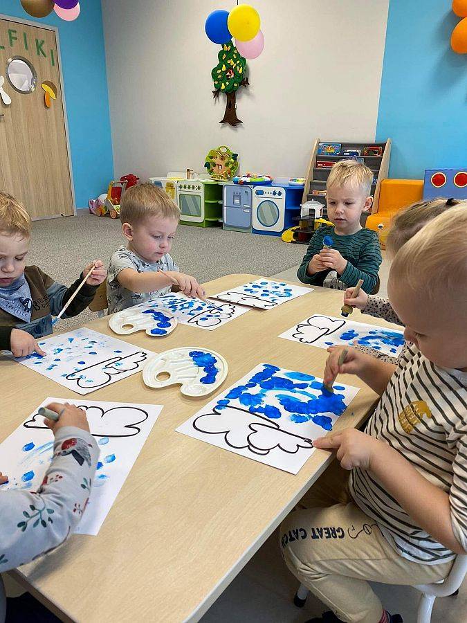Podczas tych zajęć dzieci sprawdzały także jakie warunki pogodowe panują na dworze oraz uczyliśmy się dni tygodnia. Elfiki doskonale wiedzą, że jesień to czas, kiedy deszcz pada znacznie częściej niż w innych porach roku. Dlatego też dzisiejsze zajęcia były związane z deszczem. Dzieci wykonywały piękną pracę plastyczną przy pomocy waty i niebieskiej farbki, ćwicząc przy okazji małą motorykę.