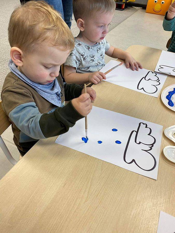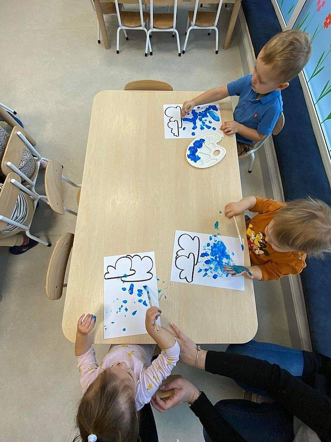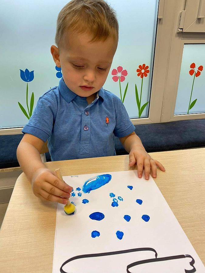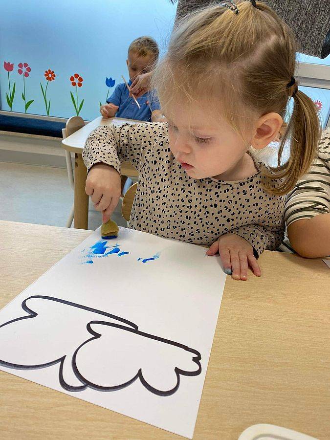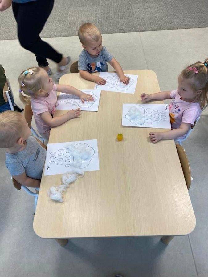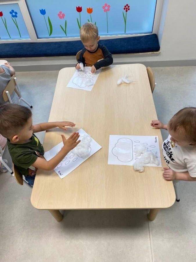 Podczas tych zajęć dzieci sprawdzały także jakie warunki pogodowe panują na dworze oraz uczyliśmy się dni tygodnia. Elfiki doskonale wiedzą, że jesień to czas, kiedy deszcz pada znacznie częściej niż w innych porach roku. Dlatego też dzisiejsze zajęcia były związane z deszczem. Dzieci wykonywały piękną pracę plastyczną przy pomocy waty i niebieskiej farbki, ćwicząc przy okazji małą motorykę.