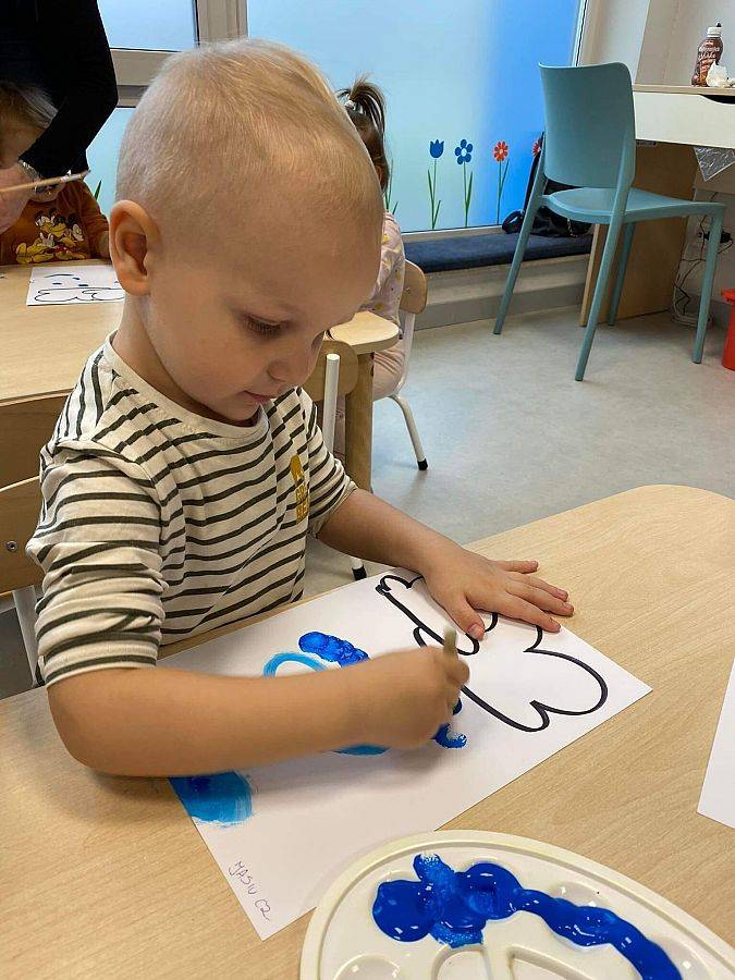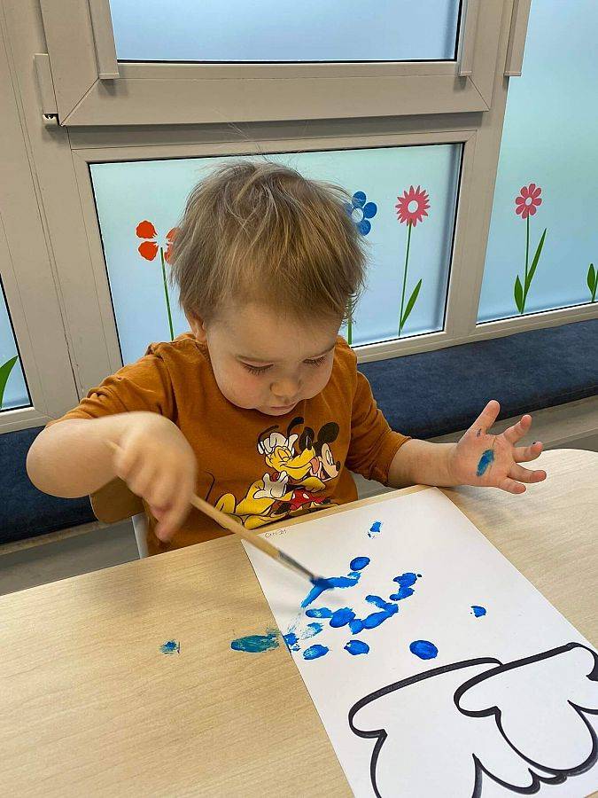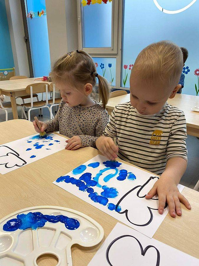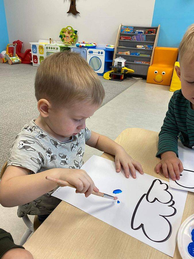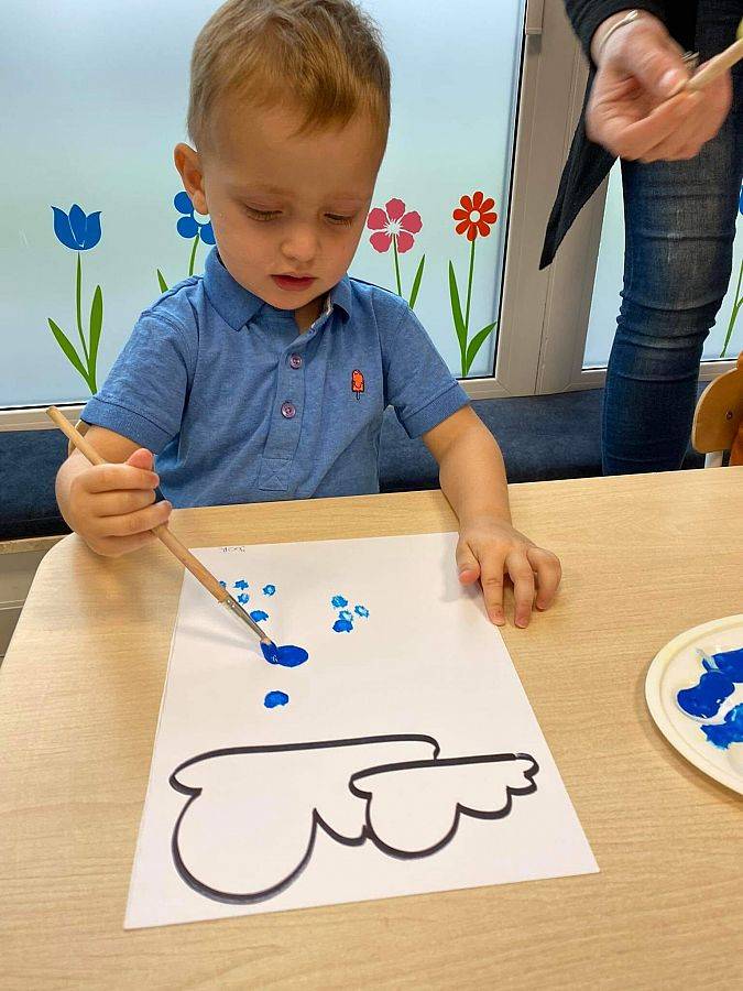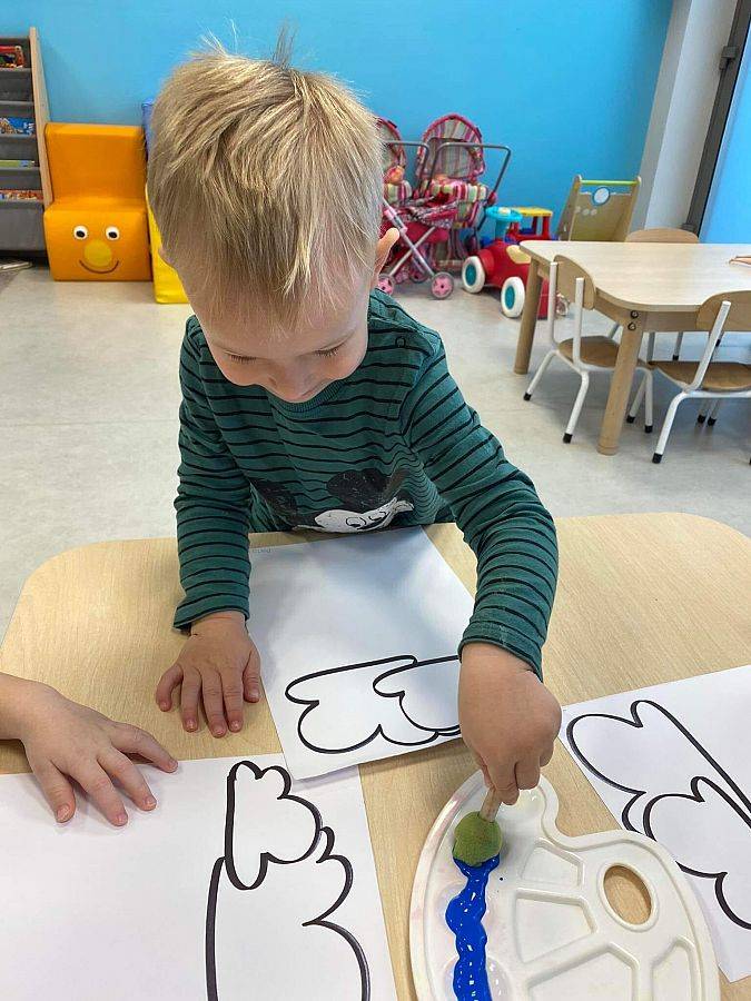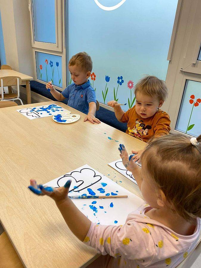 Podczas tych zajęć dzieci sprawdzały także jakie warunki pogodowe panują na dworze oraz uczyliśmy się dni tygodnia. Elfiki doskonale wiedzą, że jesień to czas, kiedy deszcz pada znacznie częściej niż w innych porach roku. Dlatego też dzisiejsze zajęcia były związane z deszczem. Dzieci wykonywały piękną pracę plastyczną przy pomocy waty i niebieskiej farbki, ćwicząc przy okazji małą motorykę.