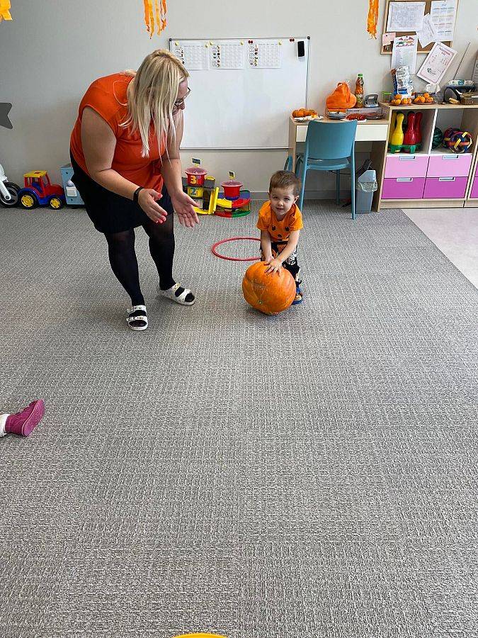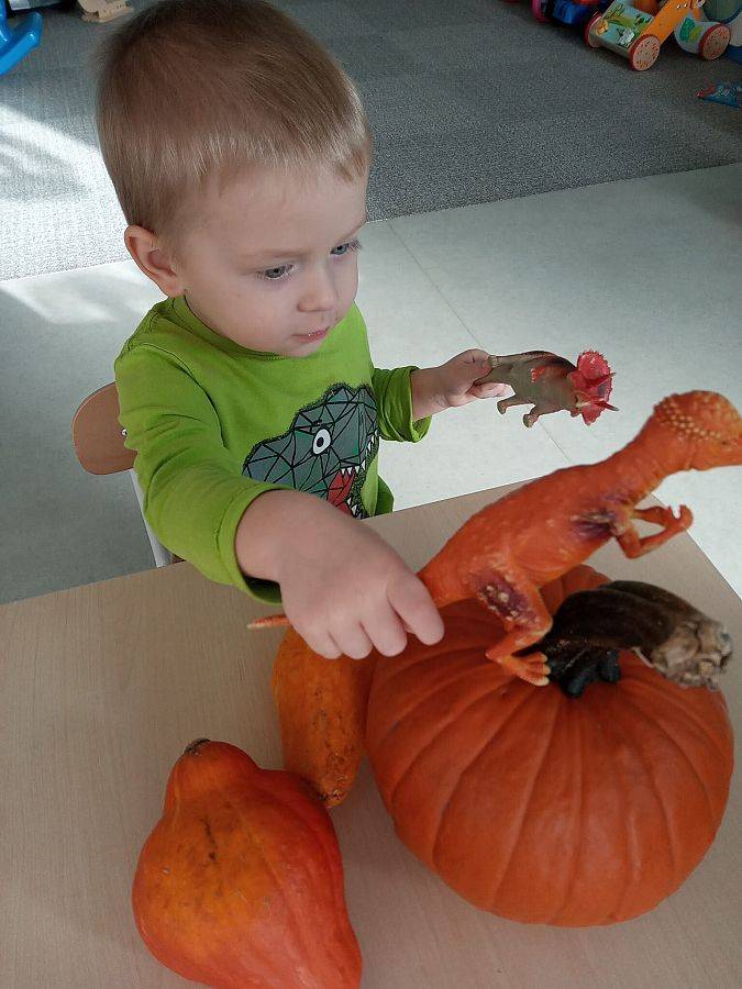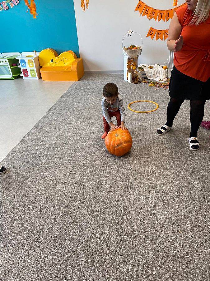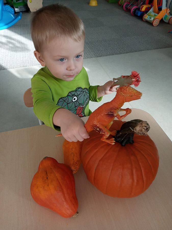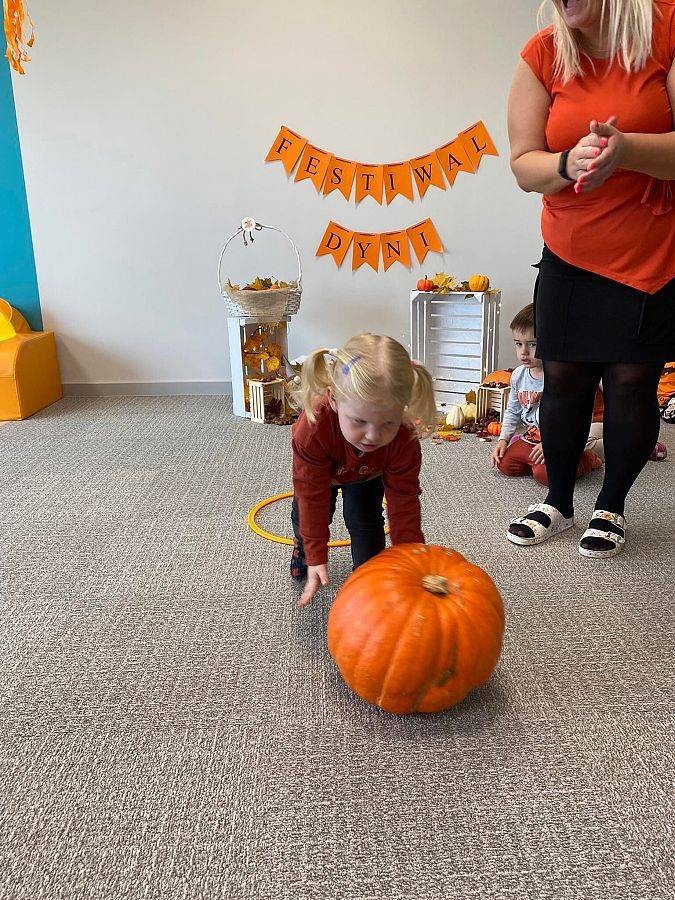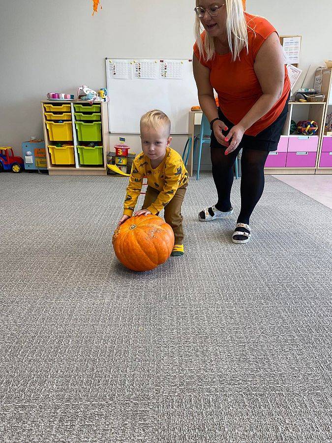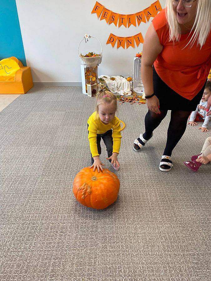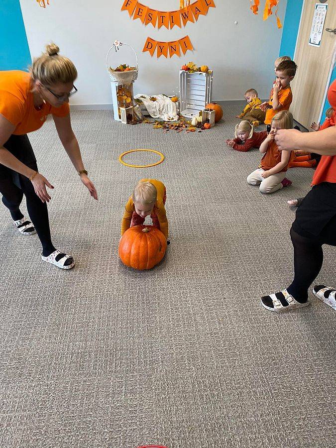 Nasze Krasnoludki z kolei z zaciekawieniem oglądały i dotykały przygotowane przez nas różnego rodzaju dynie, zapoznały się z ich kształtem, wielkością i strukturą. Bawiliśmy się również w turlanie dynią, rzut do celu oraz przeciąganie liny. Zjedliśmy przepyszny poczęstunek, za który bardzo dziękujemy wszystkim rodzicom.