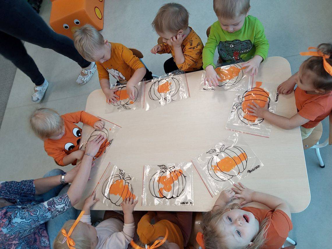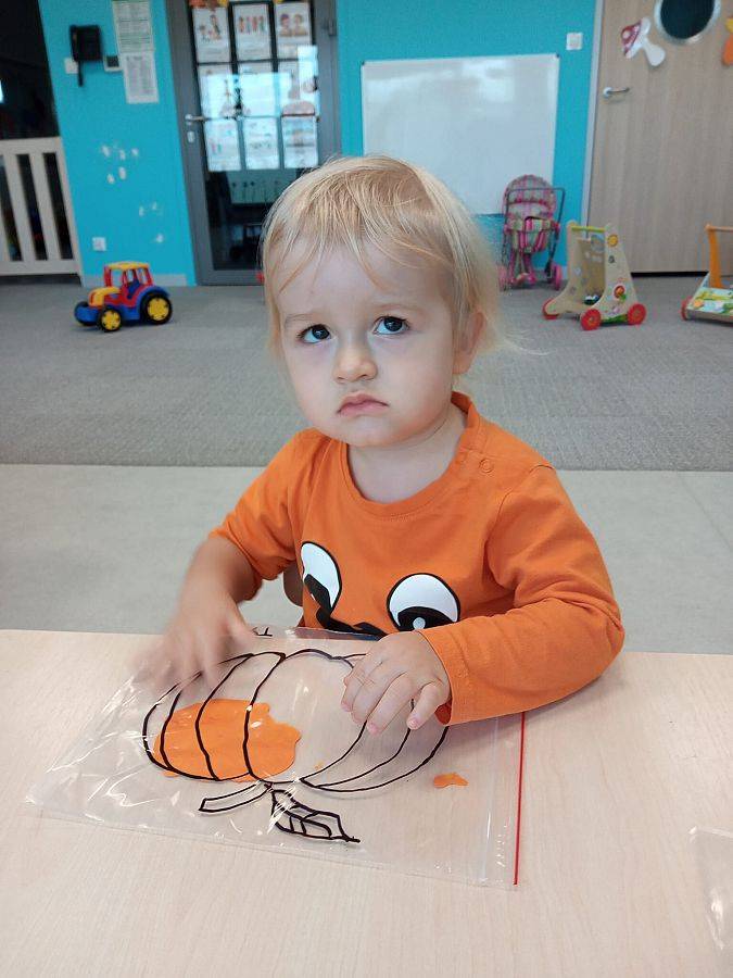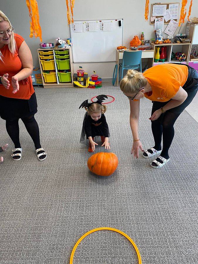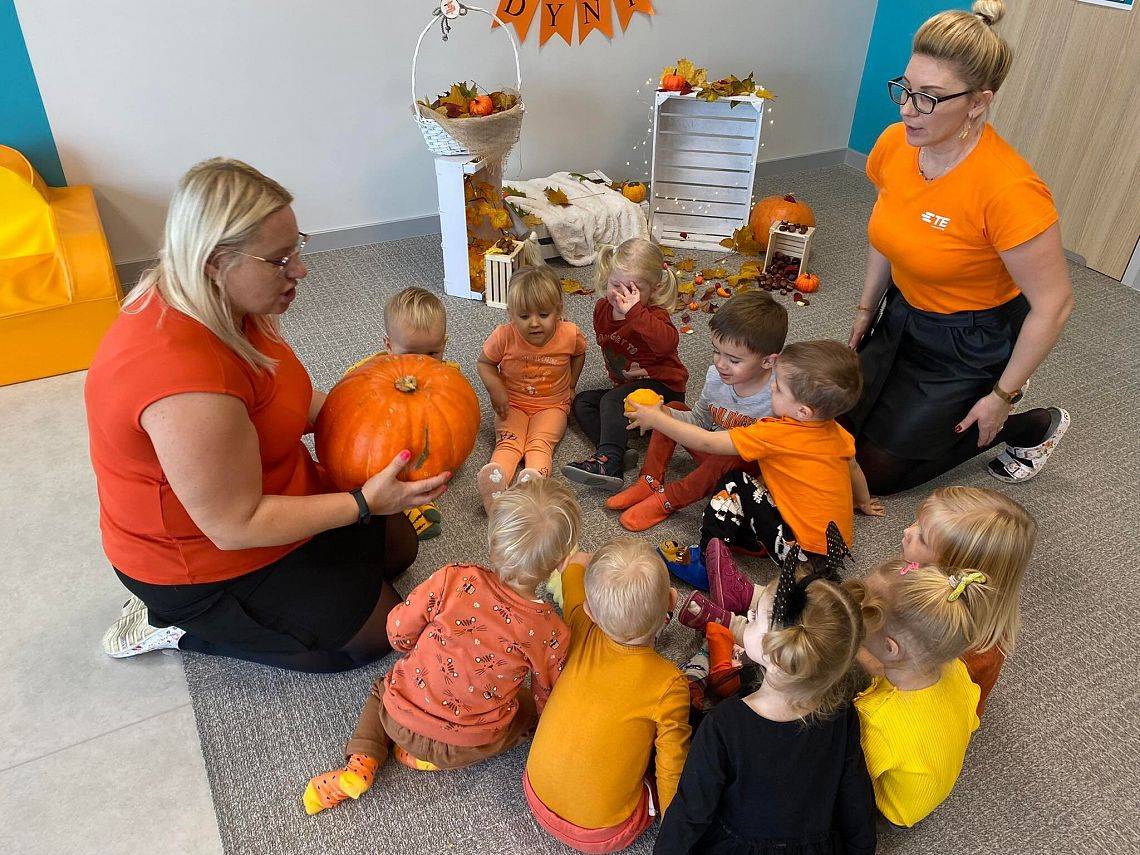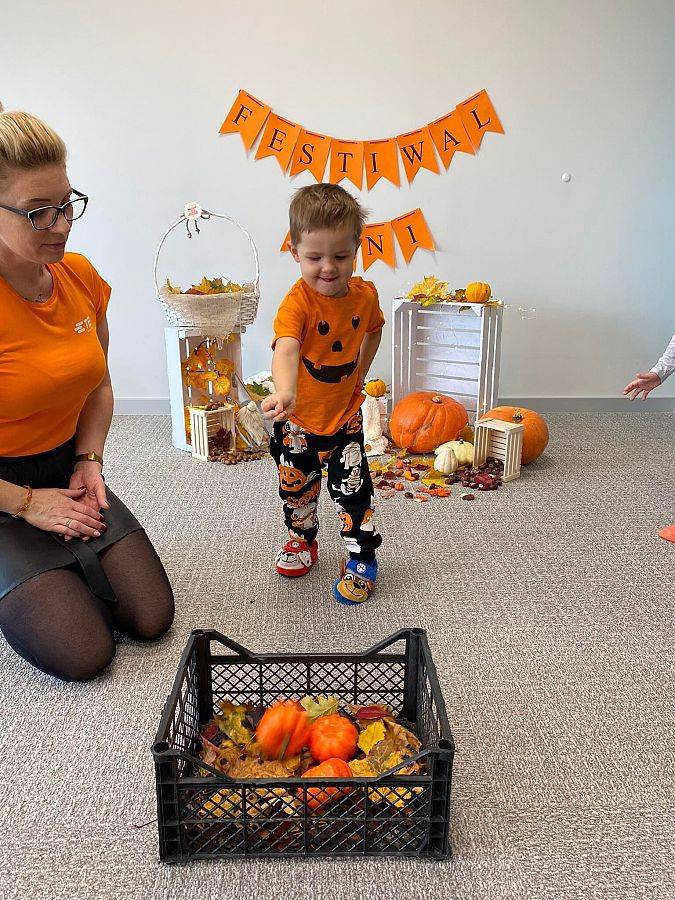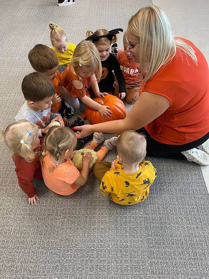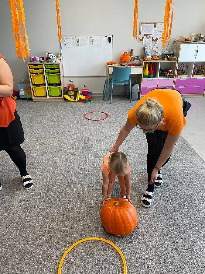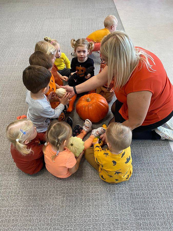 Nasze Krasnoludki z kolei z zaciekawieniem oglądały i dotykały przygotowane przez nas różnego rodzaju dynie, zapoznały się z ich kształtem, wielkością i strukturą. Bawiliśmy się również w turlanie dynią, rzut do celu oraz przeciąganie liny. Zjedliśmy przepyszny poczęstunek, za który bardzo dziękujemy wszystkim rodzicom.