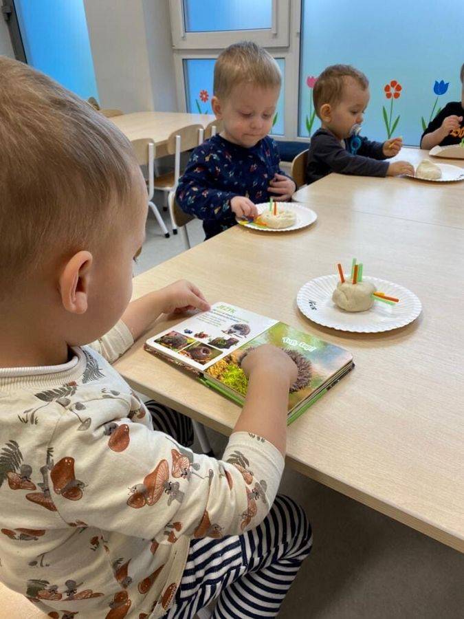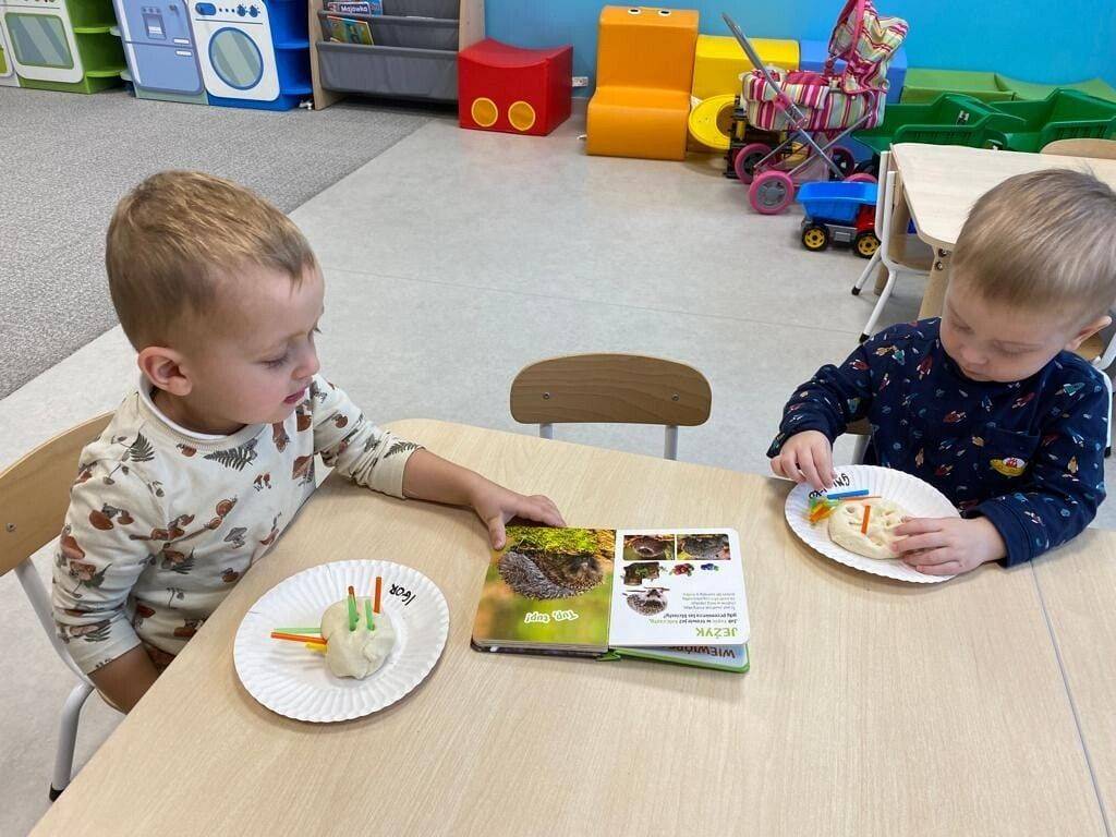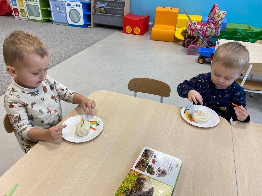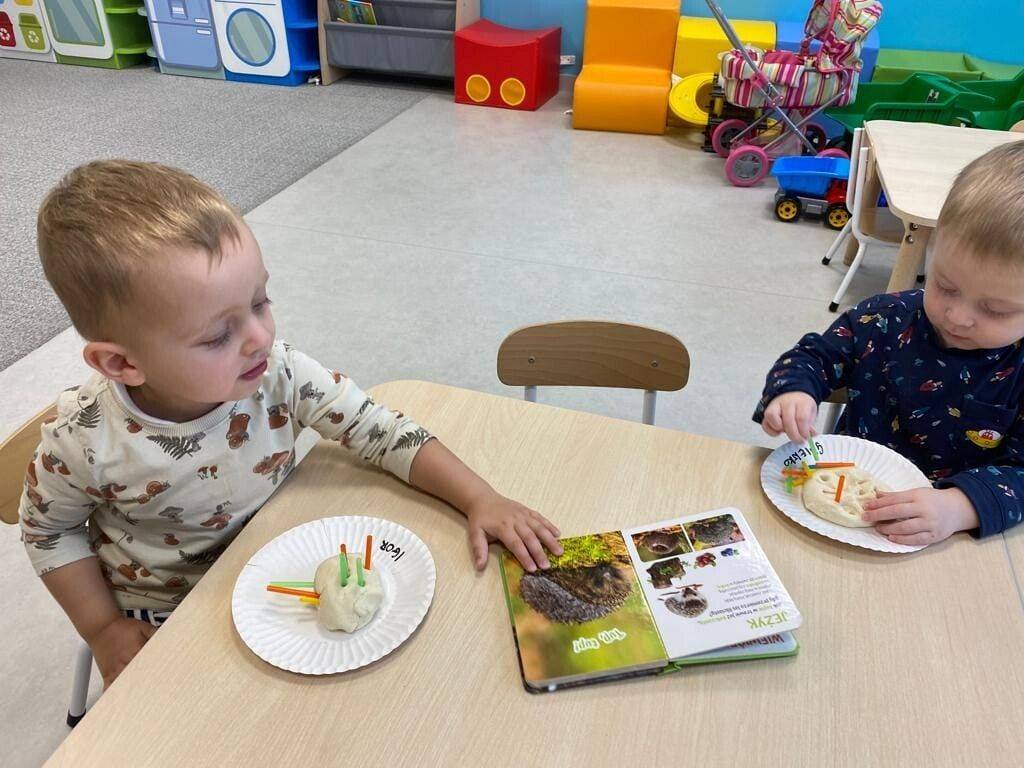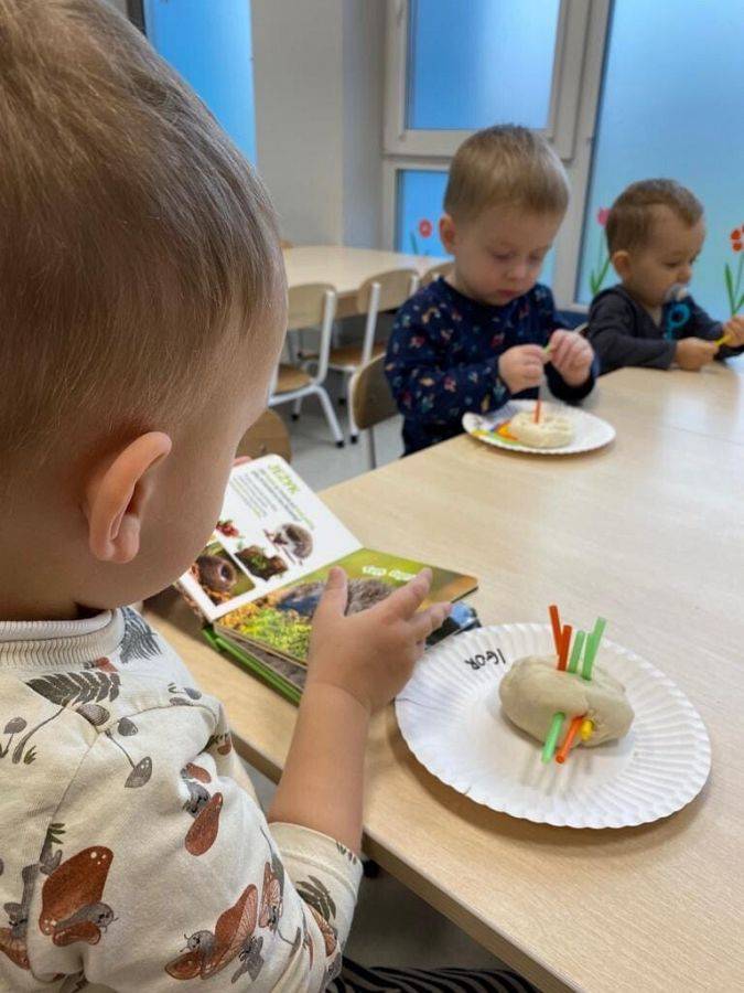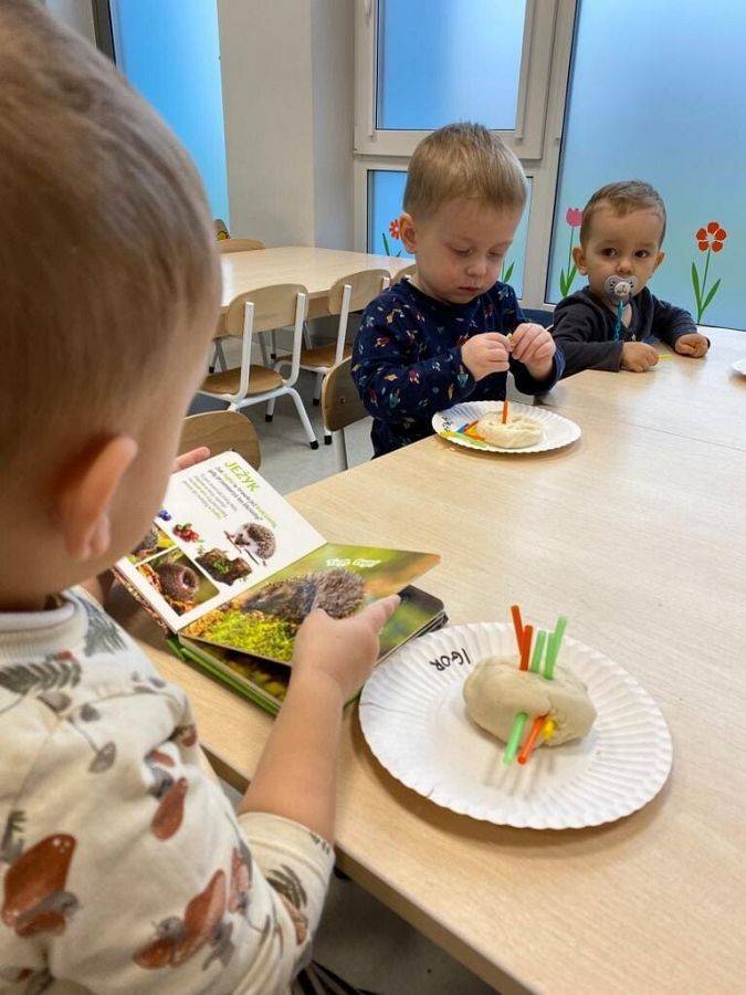 Nie wiedzą, że w listopadzie obchodzimy Dzień Jeża, bo wtedy śpią już zwinięte w ciasny kłębuszek w swoim gnieździe z liści i trawy, ukrytym wśród gałęzi na ziemi. W tym jakże ważnym dla naszej przyrody dniu, starsze dzieci wykonały prace z masy solnej. Młodsze dzieciaki ćwiczyły małą motorykę "ubierając" małego jeżyka w kolorowe kolce oraz nakładając na grzbiet czerwone jabłka.