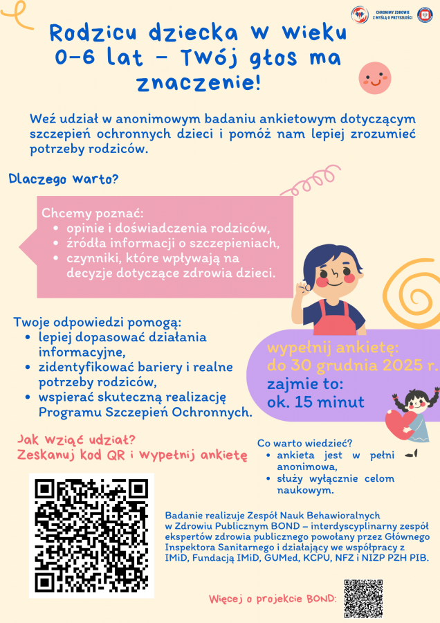 W załączeniu przesyłam pismo dotyczące badania naukowego realizowanego przez Zespół Nauk Behawioralnych w Zdrowiu Publicznym BOND, wraz z materiałami informacyjnymi przeznaczonymi do dalszej dystrybucji.