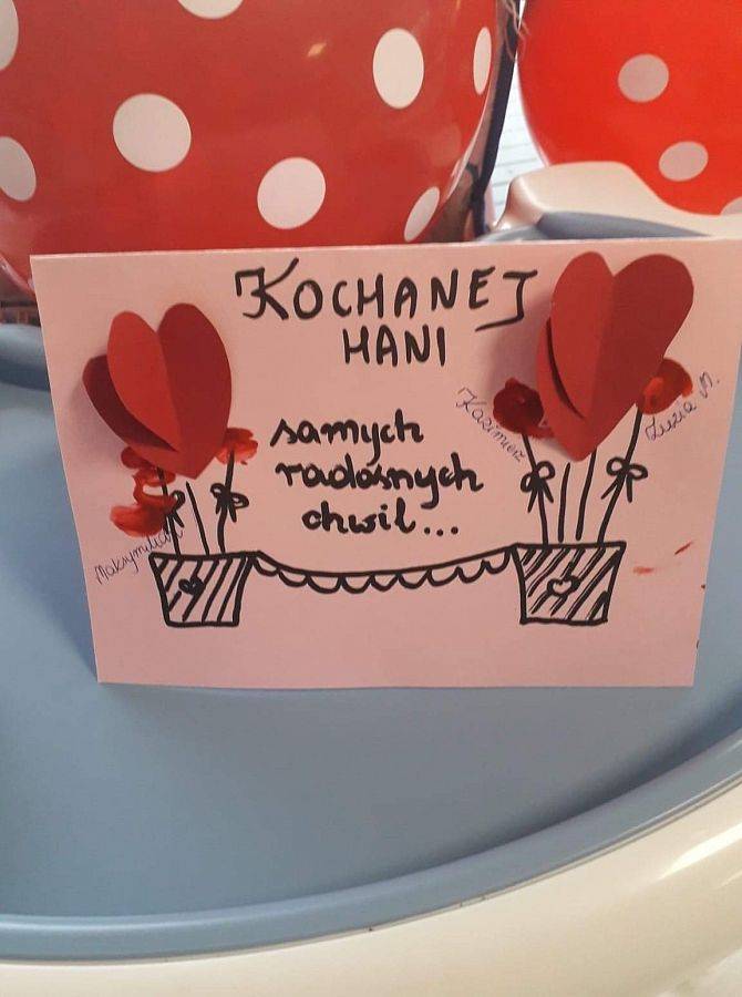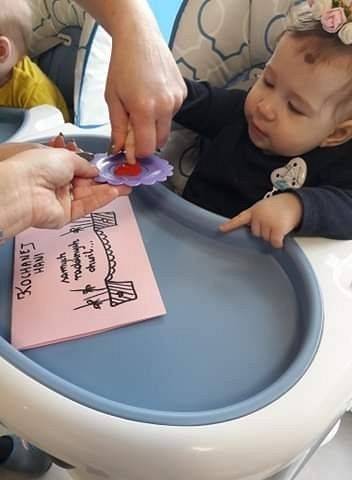 W dniu dzisiejszym w naszym żłobku było wielkie święto. Swoje Pierwsze urodzinki, a zarazem pierwsze urodziny w żłobku, obchodziła Hania z grupy Skrzaty. Nie obyło się bez śpiewu tradycyjnego "Sto Lat" oraz prezentu. Każde z dzieci zostawiło na kartce swój ślad w postaci odcisku palca. W ten sposób powstała piękna kartka urodzinowa dla Hani. Były śpiewy, poczęstunek i zabawa z balonami.
