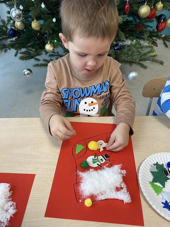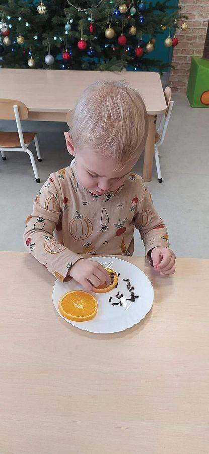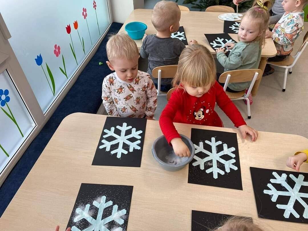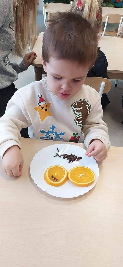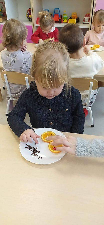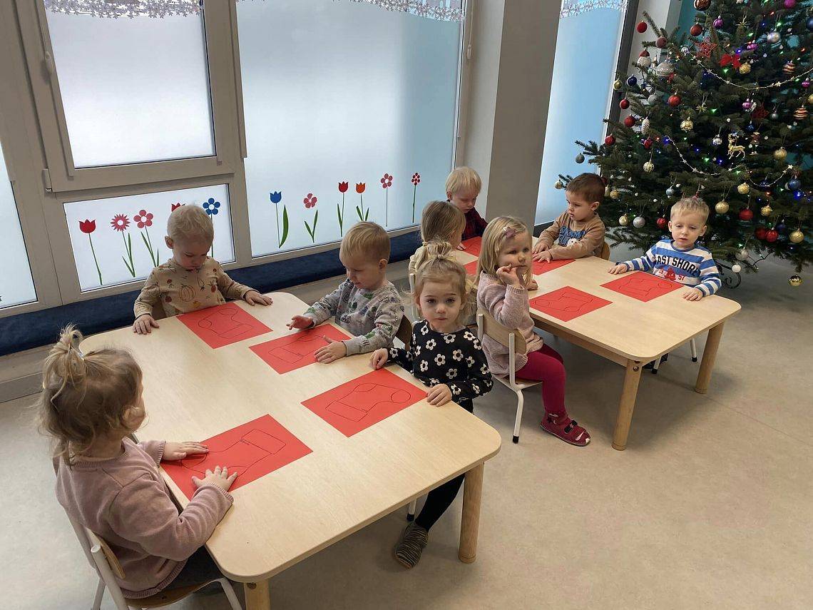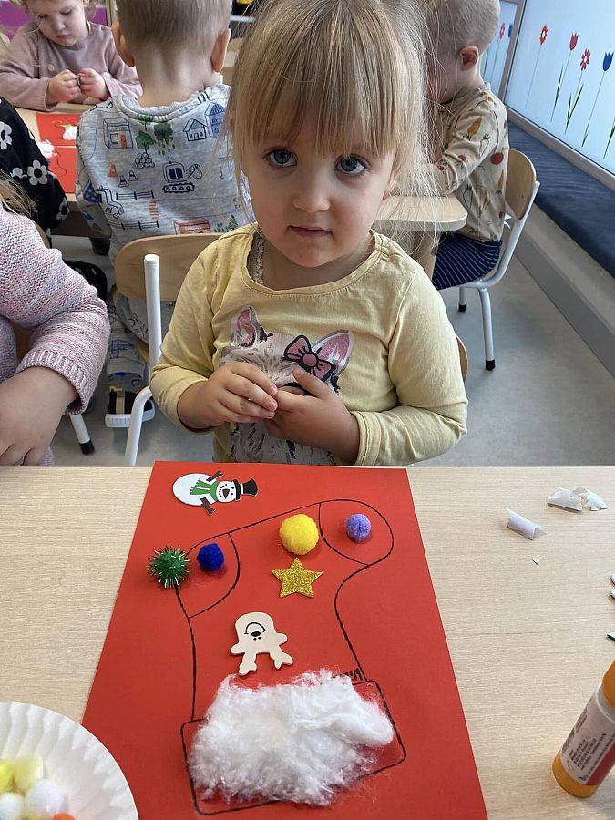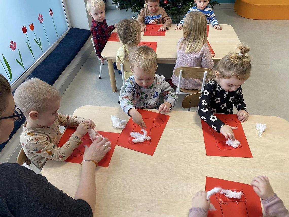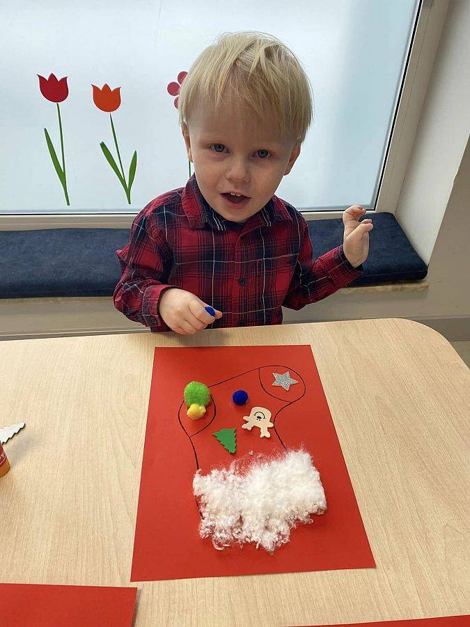 W Grudniu grupa Krasnoludki skupiała się na zajęciach rozwijających motorykę małą oraz doznania sensoryczne. Z okazji Mikołajek dzieci wykonały świąteczne skarpety, które ozdabiały według własnego uznania. Nawiązując do zimowej aury grudnia maluszki zapoznały się z cukrem, który okazał się bardzo słodki w smaku. Ćwicząc swoje małe paluszki dzieci posypywały nim śnieżynki, tworząc na nich szron. Nie ominęły nas również przygotowania do świąt. Dzieci wykonały pachnące ozdoby choinkowe z pomarańczy oraz wykrajały świąteczne pierniczki.