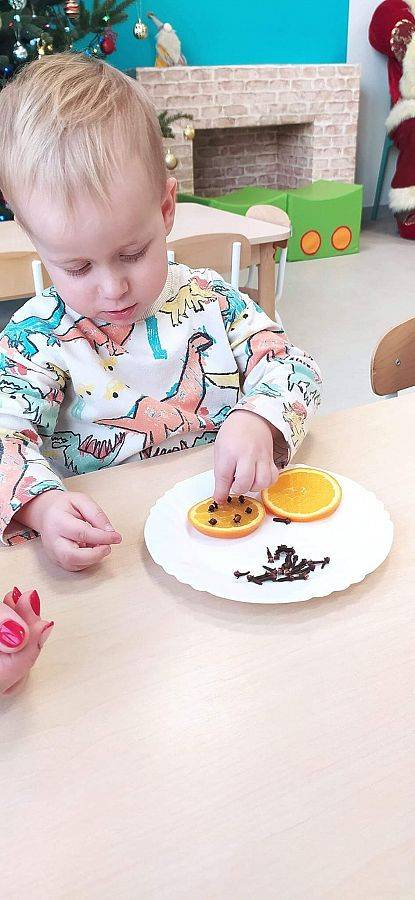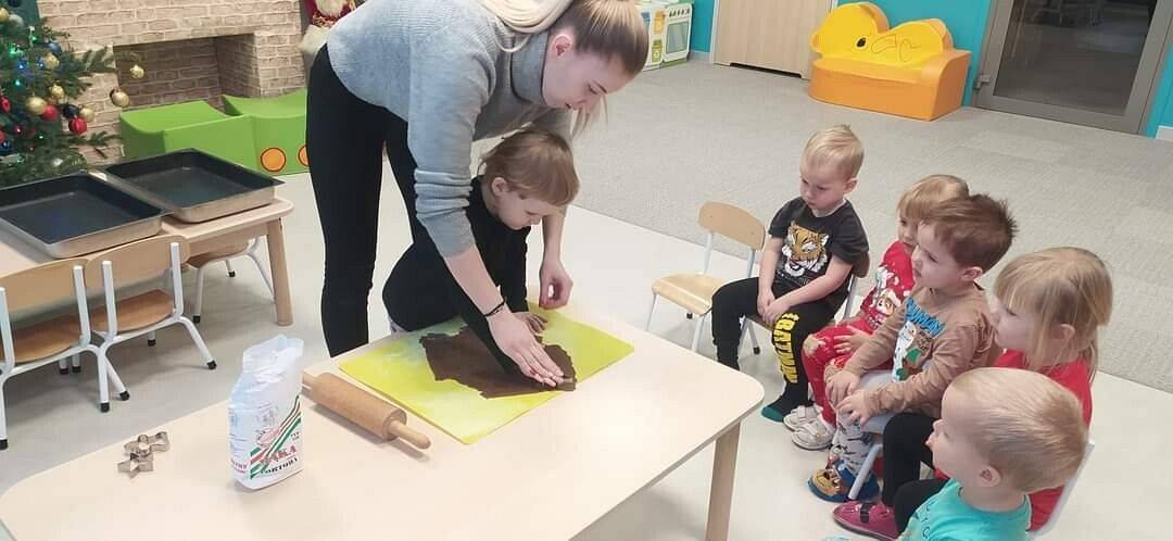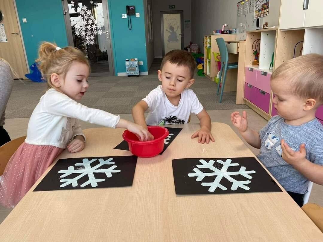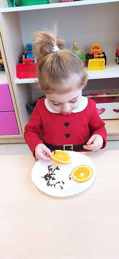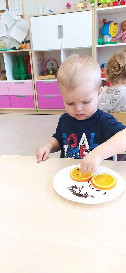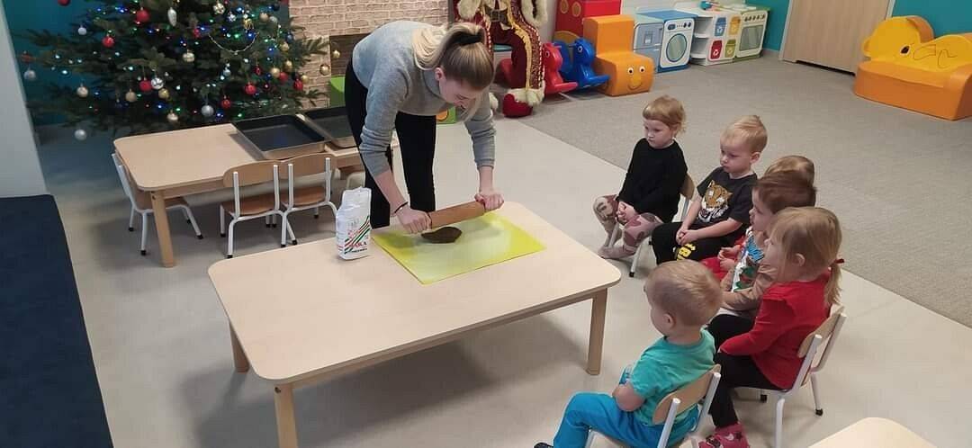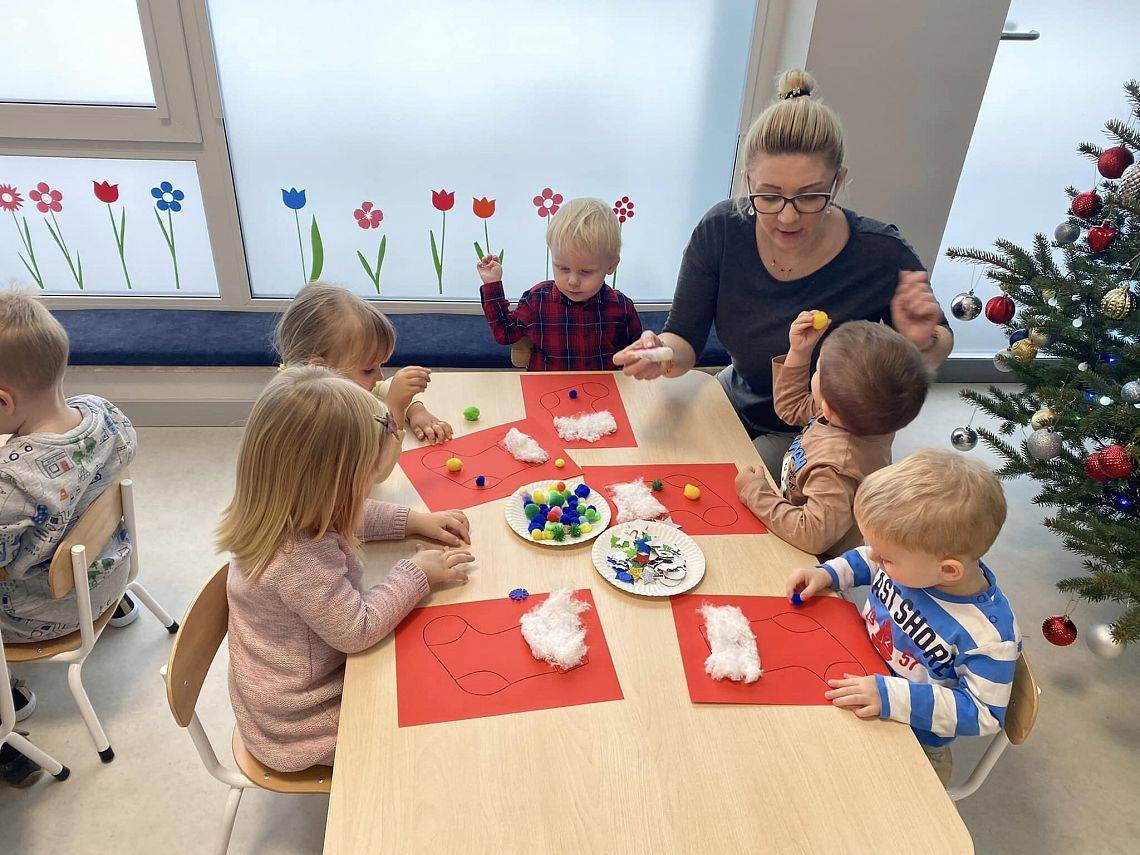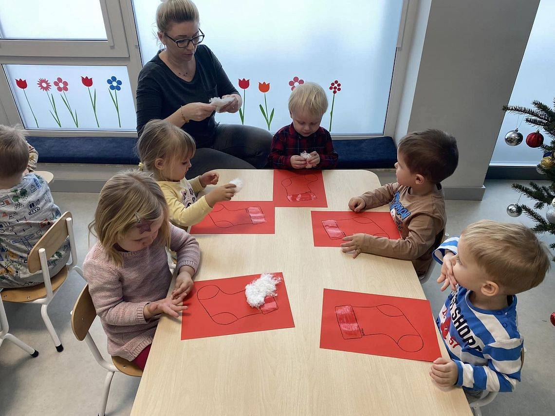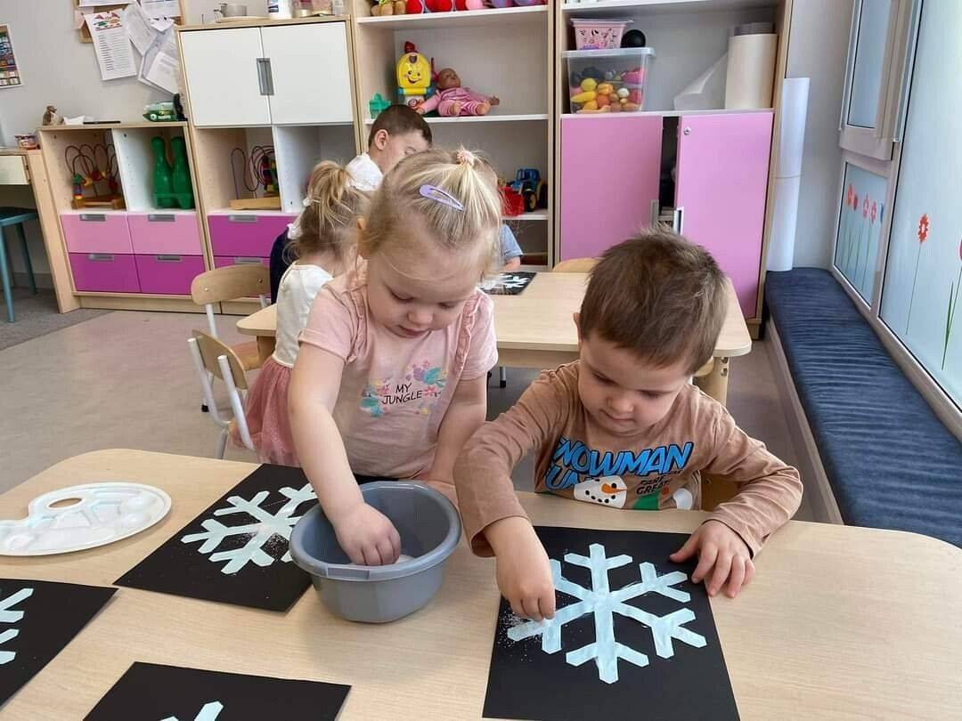 W Grudniu grupa Krasnoludki skupiała się na zajęciach rozwijających motorykę małą oraz doznania sensoryczne. Z okazji Mikołajek dzieci wykonały świąteczne skarpety, które ozdabiały według własnego uznania. Nawiązując do zimowej aury grudnia maluszki zapoznały się z cukrem, który okazał się bardzo słodki w smaku. Ćwicząc swoje małe paluszki dzieci posypywały nim śnieżynki, tworząc na nich szron. Nie ominęły nas również przygotowania do świąt. Dzieci wykonały pachnące ozdoby choinkowe z pomarańczy oraz wykrajały świąteczne pierniczki.