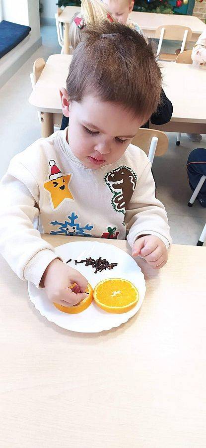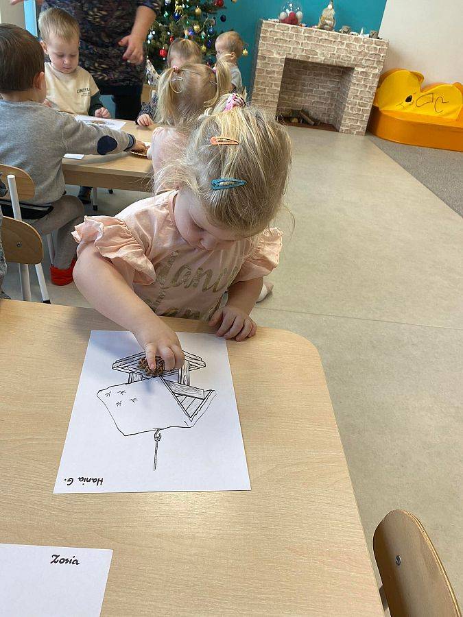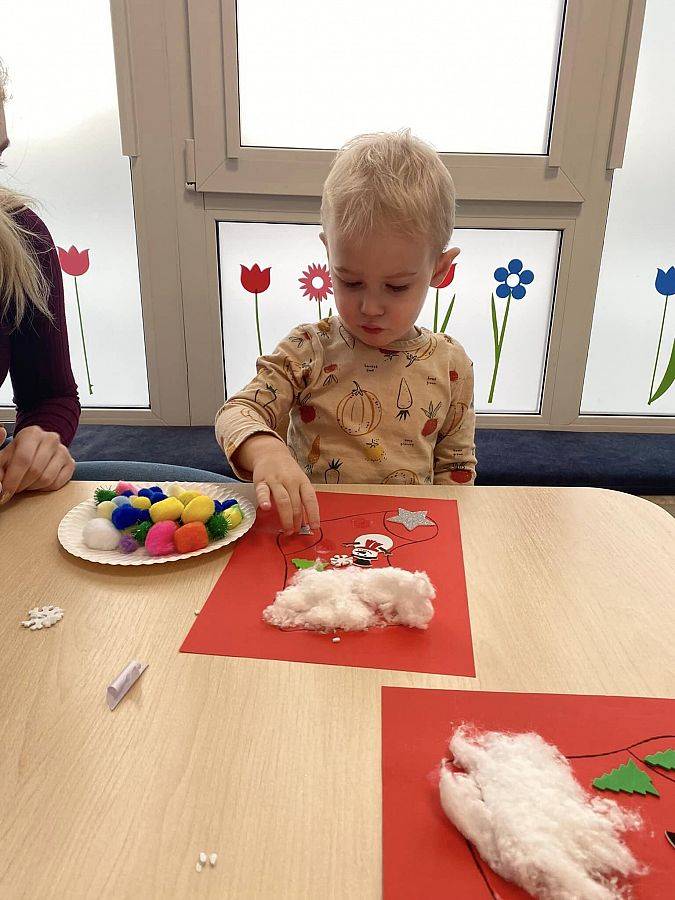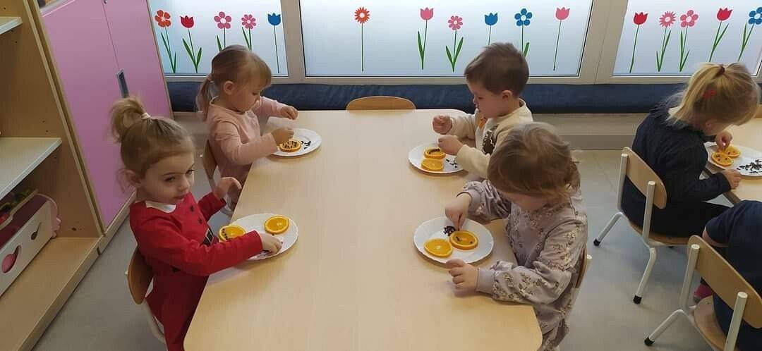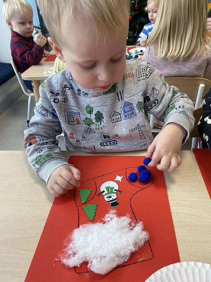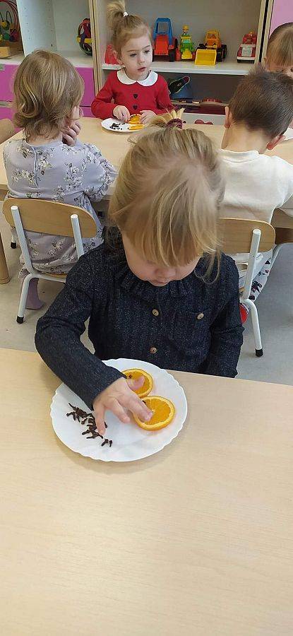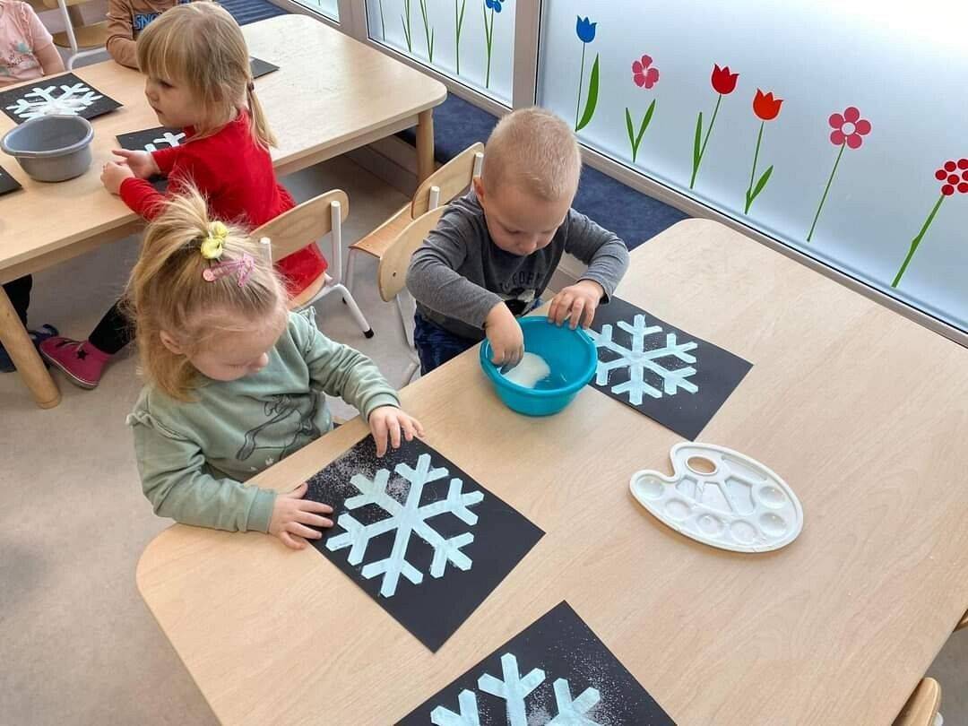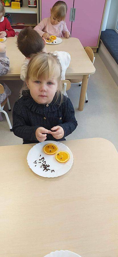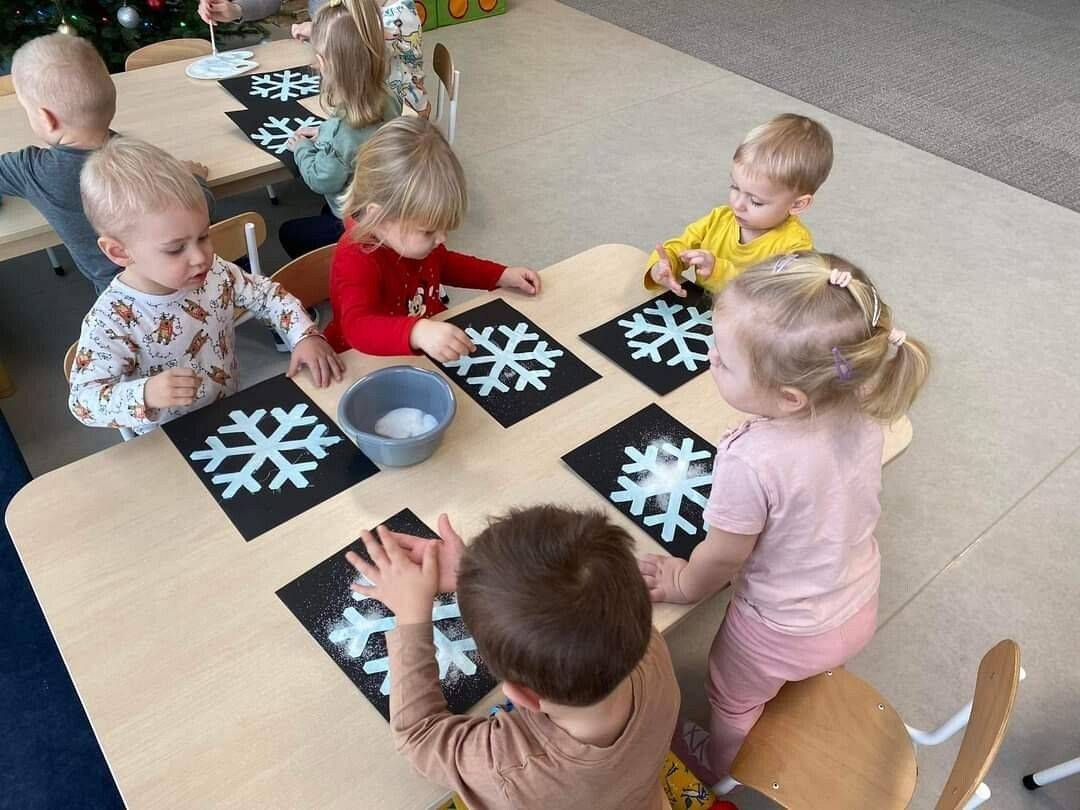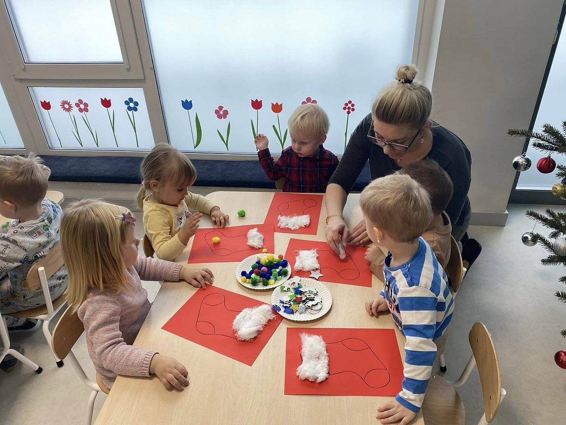 W Grudniu grupa Krasnoludki skupiała się na zajęciach rozwijających motorykę małą oraz doznania sensoryczne. Z okazji Mikołajek dzieci wykonały świąteczne skarpety, które ozdabiały według własnego uznania. Nawiązując do zimowej aury grudnia maluszki zapoznały się z cukrem, który okazał się bardzo słodki w smaku. Ćwicząc swoje małe paluszki dzieci posypywały nim śnieżynki, tworząc na nich szron. Nie ominęły nas również przygotowania do świąt. Dzieci wykonały pachnące ozdoby choinkowe z pomarańczy oraz wykrajały świąteczne pierniczki.